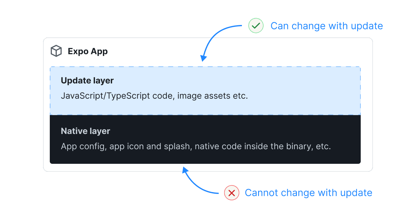 Even after securing entitlements, we still had to deal with another major obstacle: the traditionally slow app release cycle. Any minor fix required publishing a new build, which was time-consuming (and can turn your Mac into a grilled cheese maker). After dealing with this for a while, we adopted the model of OTA (Over the Air) updates. This allowed us to remotely trigger updates without needing a new app build. Conveniently, Expo offers this solution in their EAS Updates service. We setup a Github Action to publish a new OTA update on every commit to the main branch, allowing us to have continuous deployment. The diagram below shows a basic overview of how this is possible.