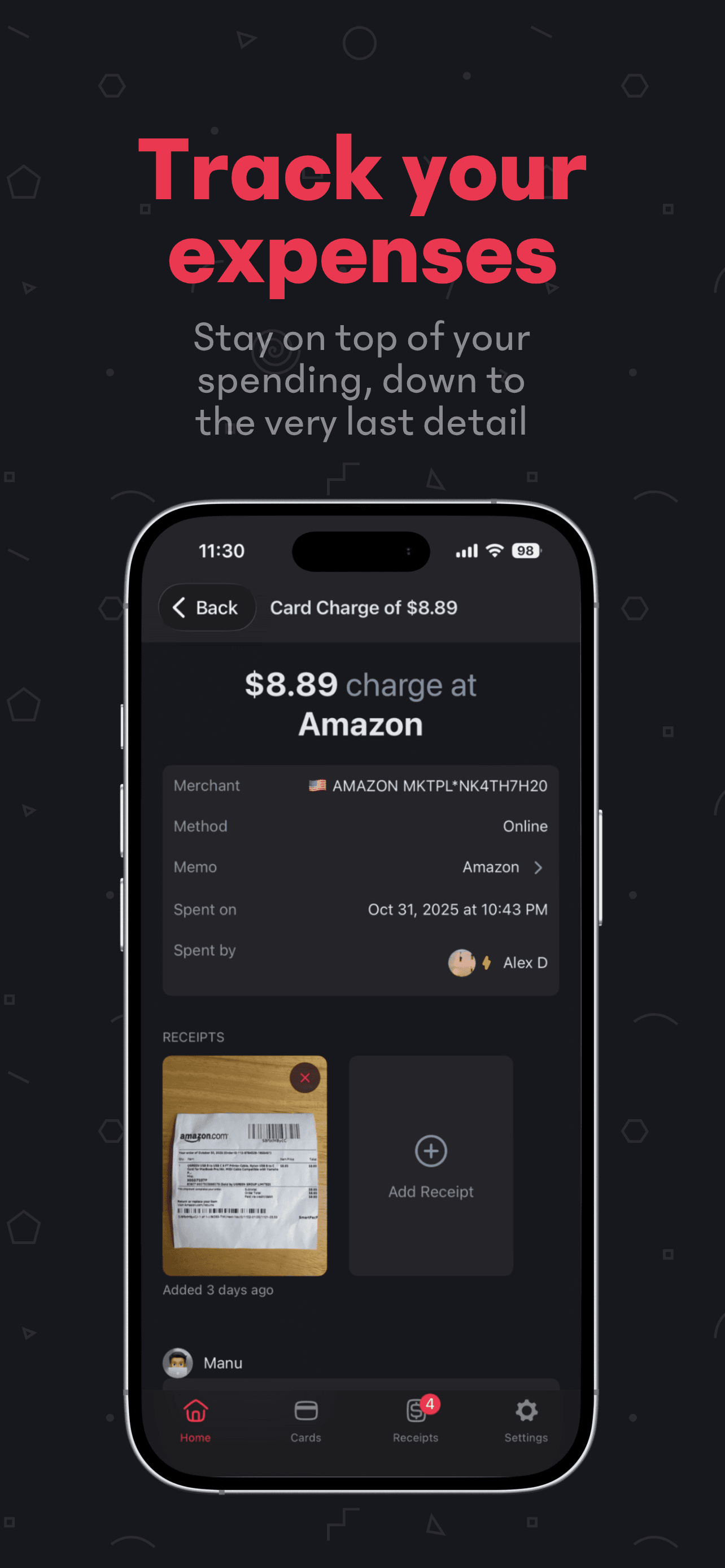 Before building app features, though, we needed a robust API on HCB itself. Over several months, we expanded our v4 API to support functionality like creating cards, managing receipts, and inviting users to HCB organizations.